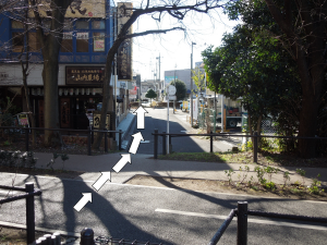細い歩道を横切り、真直ぐ進みます。